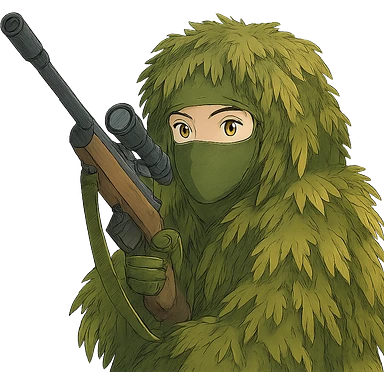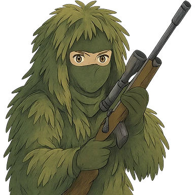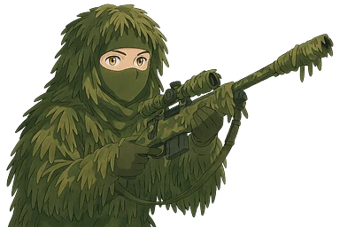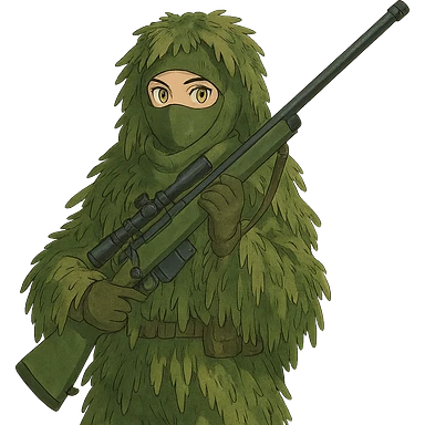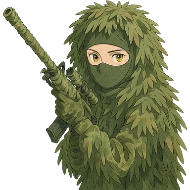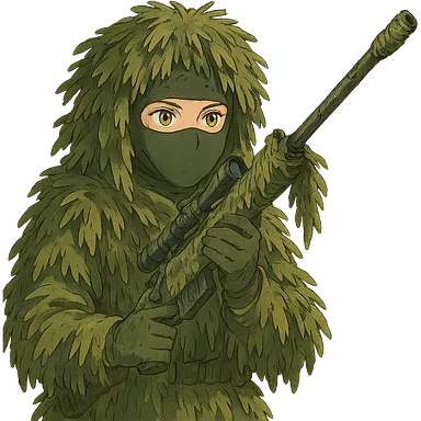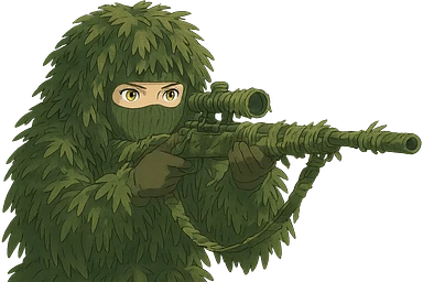 1 female, gold yellow eyes, face covered green balaclava, full military ghillie sniper camouflage, rifle up, camouflaged rifle wrap emoji