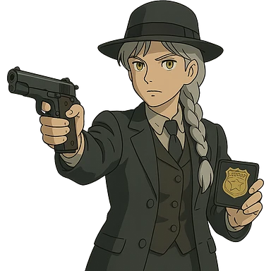 1 female, 1920's mens suit, long white hair braid, gold yellow eyes, muted dark colors, brandishing a colt 1911 and a detective badge emoji