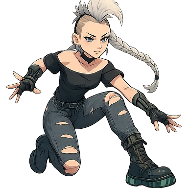 1 female, cyberpunk, mohawk white hair, 1 long braid, cybergoth, gothic style, action pose, style of anime, she is looking into the camera, black short sleeve off shoulder top, ripped tight jeans, combat boots emoji