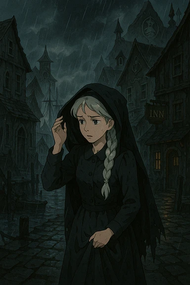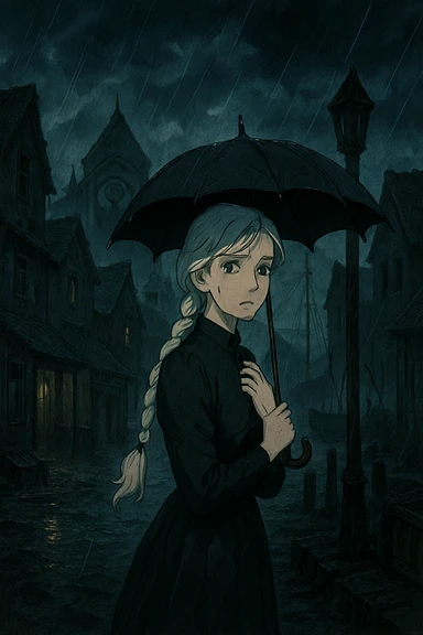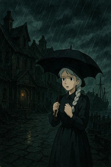 A dark port town, poverty, abandoned stormy, horror novel, innsmouth, cult of Dagon, there is 1 female with a long white braid and traditional 1930's dress clothes, dark dress, shielding herself from the rain emoji