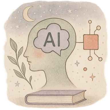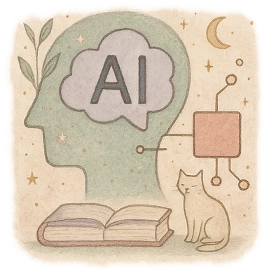 artificial inteligence A gentle, poetic digital illustration in the style of “Jardim da Ju”. The scene blends nature, cosmos and tenderness — hand-drawn lines, soft textures, and muted pastel tones (sage green, lilac, rose, cream). Elements like leaves, stars, cats, books, and celestial details coexist naturally. The mood is magical yet grounded, evoking sensitivity, reflection, and quiet intelligence. The lighting is warm and dreamy, with delicate sparkles and organic shapes. Artistic style: watercolor + fine line art, minimal, elegant, emotional and intimate. (use conforme a IA utilizada) Mood: magical realism, soft light, emotional, feminine, intellectual Style keywords: watercolor, fine ink lines, pastel tones, digital illustration, cozy, slow aesthetic, minimal poetic composition Colors: #9BA48A (verde sálvia), #E6B7B1 (rosa suave), #D0C3CC (lavanda névoa), #F6F1E7 (papel de chá), #2D2D2F (grafite noturno) Objects recorrentes: folhas, flores, livros, chá, gatos, estrelas, constelações, velas, mãos, janelas abertas, estufas, estantes, sementes, instrumentos musicais Emoção central: sensibilidade lúcida — calma, introspectiva e real emoji