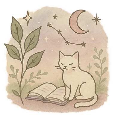 A gentle, poetic digital illustration in the style of “Jardim da Ju”. The scene blends nature, cosmos and tenderness — hand-drawn lines, soft textures, and muted pastel tones (sage green, lilac, rose, cream). Elements like leaves, stars, cats, books, and celestial details coexist naturally. The mood is magical yet grounded, evoking sensitivity, reflection, and quiet intelligence. The lighting is warm and dreamy, with delicate sparkles and organic shapes. Artistic style: watercolor + fine line art, minimal, elegant, emotional and intimate. (use conforme a IA utilizada) Mood: magical realism, soft light, emotional, feminine, intellectual Style keywords: watercolor, fine ink lines, pastel tones, digital illustration, cozy, slow aesthetic, minimal poetic composition Colors: #9BA48A (verde sálvia), #E6B7B1 (rosa suave), #D0C3CC (lavanda névoa), #F6F1E7 (papel de chá), #2D2D2F (grafite noturno) Objects recorrentes: folhas, flores, livros, chá, gatos, estrelas, constelações, velas, mãos, janelas abertas, estufas, estantes, sementes, instrumentos musicais Emoção central: sensibilidade lúcida — calma, introspectiva e real emoji