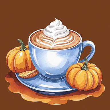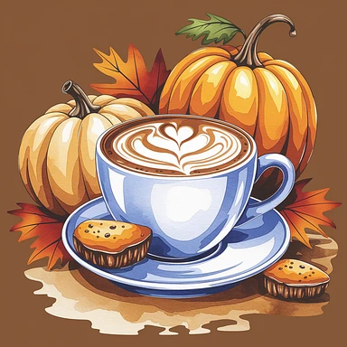 coffee latte art seamless background, pumpkin spice latte, creamy brown and orange tones, cozy autumn café vibe, watercolor effect emoji