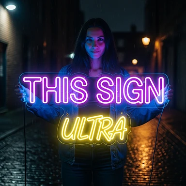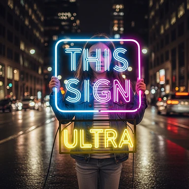 make a girl holding this sign, but sign in made of neon, also add ultra below the sign emoji
