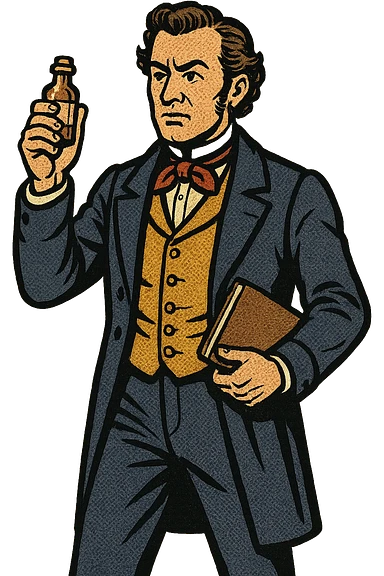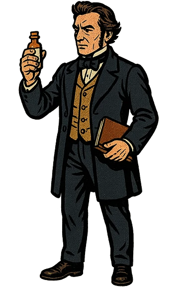 The full body of a male English surgeon from the 1800s holding a small bottle of medicine and a note book emoji