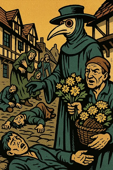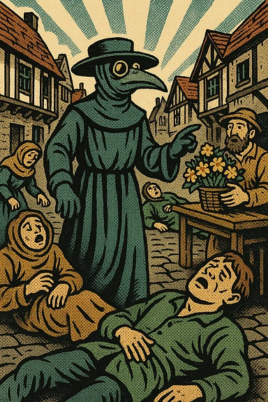 A street scene from a town in the 1600s in England with a plague doctor, several plague victims and an apothecary selling strong smelling flowers. This will show the Great Plague of 1665 emoji