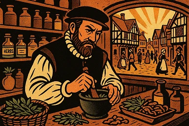 A man working in an apothecary selling a wide range of herbs and medications from the 1600s in a busy town shop from the tudor era emoji