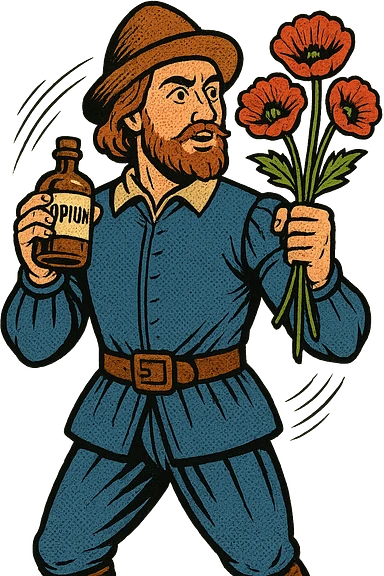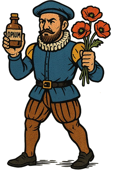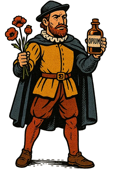 the full body of a tudor explorer sailor holding poppies and an old medicine bottle with the word opium on it emoji