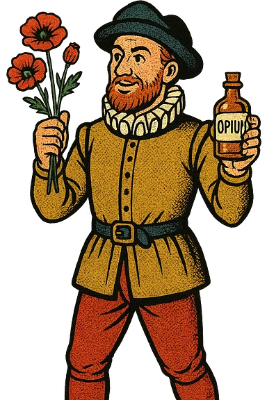 the full body of a tudor explorer sailor holding small poppies and an old medicine bottle with the word opium on it emoji