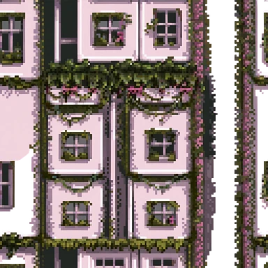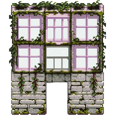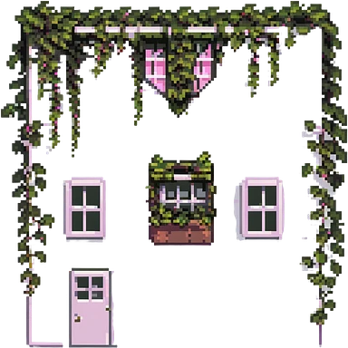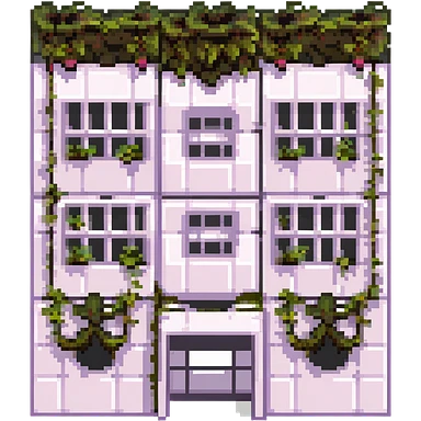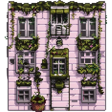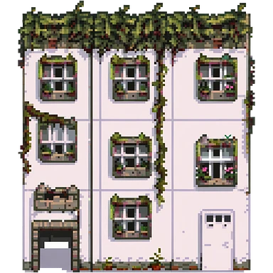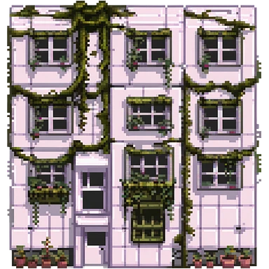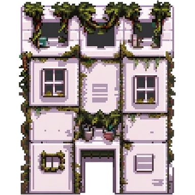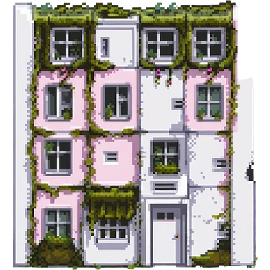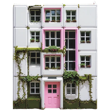Сделай русскую панельку белого цвета. Она должна быть в виде куба, а также с окнами 3 на 3 на каждом фасаде. Панелька заросла лозой и мхом, некоторые окна розовые. Панелька должна быть в форме куба. emoji