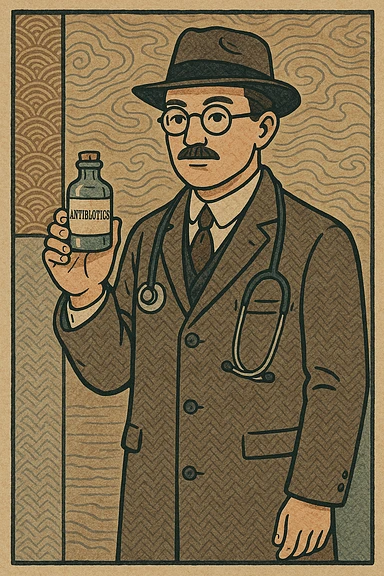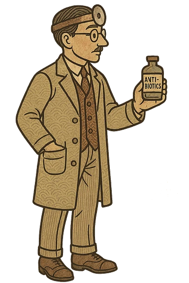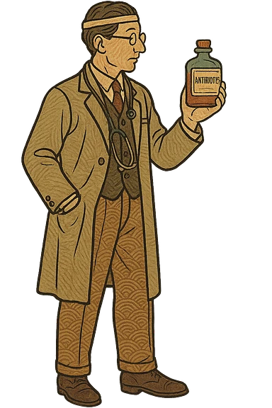 A 1920s doctor standing with a bottle of antibiotics emoji