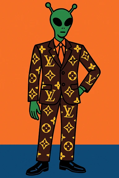 Green tall alien wearing Louis Vutton suit emoji