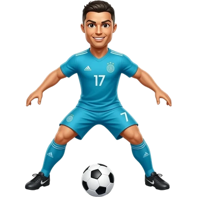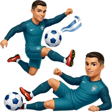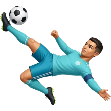 Cristiano Ronaldo con ropa azul turquesa haciendo una chilena Está saltando muestras está tumbado chutando a una pelota emoji