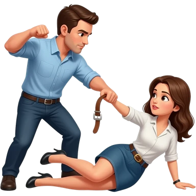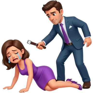 Un hombre pegando a una mujer de morado La mujer está en el suelo llorando y el hombre está golpeándole con un cinturón El hombre está enfadado emoji