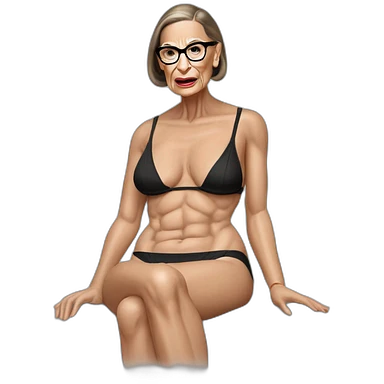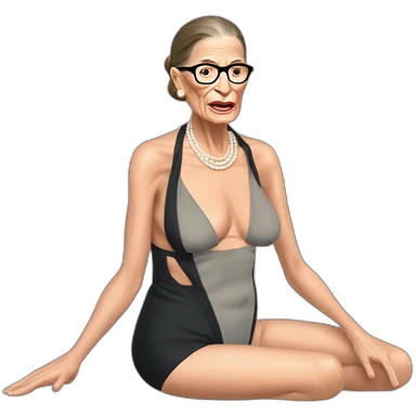 sexy ruth bader ginsburg wearing string bikini with crotchless bikini bottoms bare chest acting out that scene from basic instinct (full body, ios17, sitting legs apart,adult) emoji