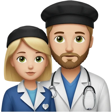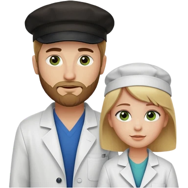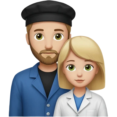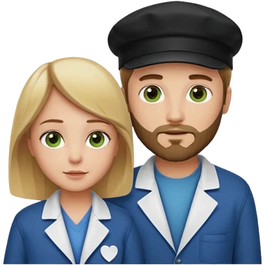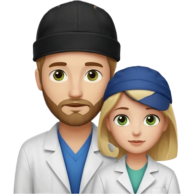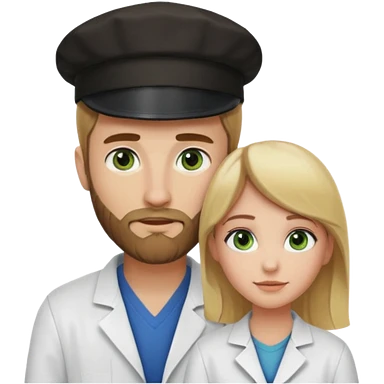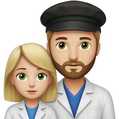 a blonde bearded guy wearing black cap, tall, fair skinned, brown eyes, looking into the girls eyes who is short than him having green eyes and brown hair, who is in love with the guy, girl is wearing a lab coat, guy is wearing a brown jacket and blue jeans emoji