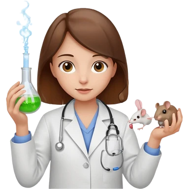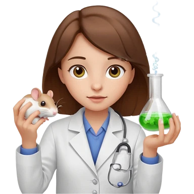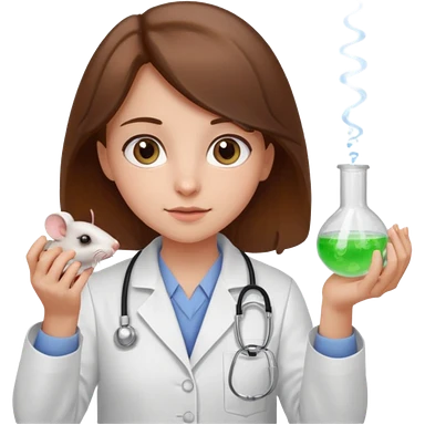a cute brown haired girl with hazel eyes holding a white mice in hand doing experiment in lab emoji