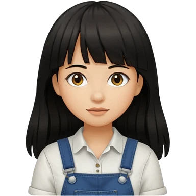 Make it a girl wil long hair like this and look like this she has brown ish black hair and if has bangs with black overalls and a white shirt emoji