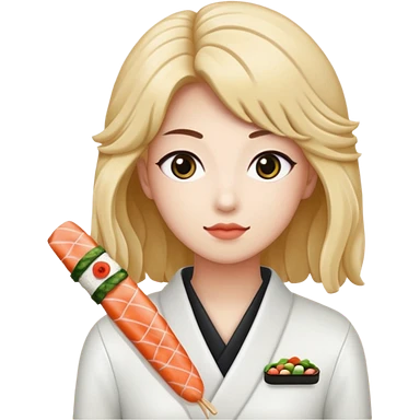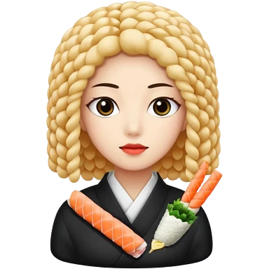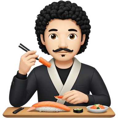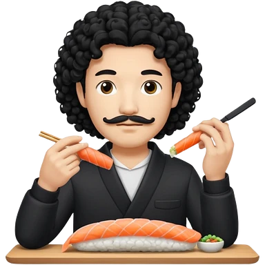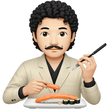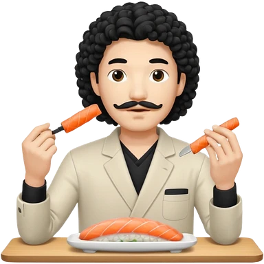un coreano che taglia sushi con i baffetti capelli ricci e lunghi neri con un IQOS in mano emoji