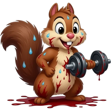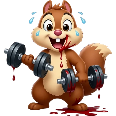 Realistic exhausted bloody chipmunk Chip from Chip 'n' Dale, labeled "courage", holding dumbbell, sweat and blood, barely breathing, dark gritty style, premium Telegram emoji, transparent background, muted dark reds and grays, not cartoonish. emoji