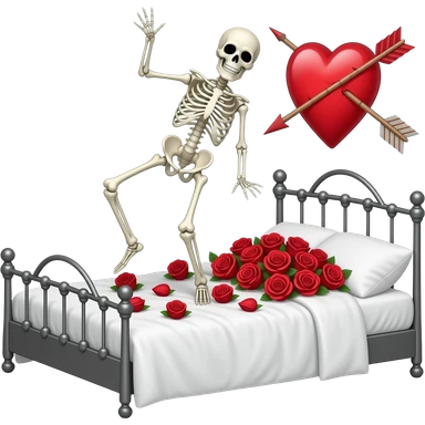 Skeleton dancing on a bed of red roses with a heart with an arrow piercing it as background emoji