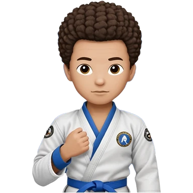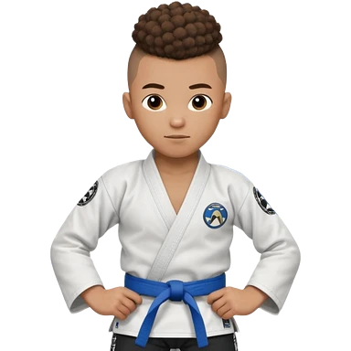 Mixed race boy BJJ instructor with pony tail afro hair and shaved bald sides haircut, Make the hair brown and the belt blue. Add the roger Gracie academy logo on the go also and the p logo of progress jiu jitsu on the right arm sleeve at the top emoji