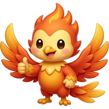 friendly chibi phoenix giving thumbs up gesture with wing, smiling expression, soft flames, warm colors, bold outline, discord emoji style, transparent background emoji