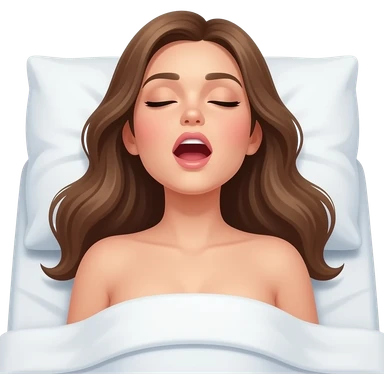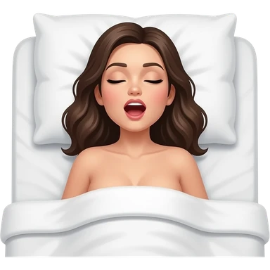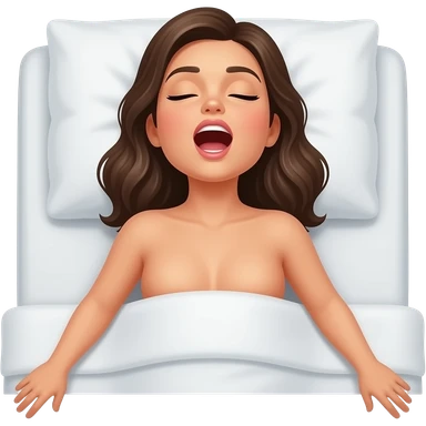 naked woman lying on back, on bed, head tilted back, mouth open, eyes closed, knees bent, legs spread, average breasts. emoji