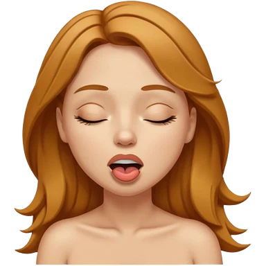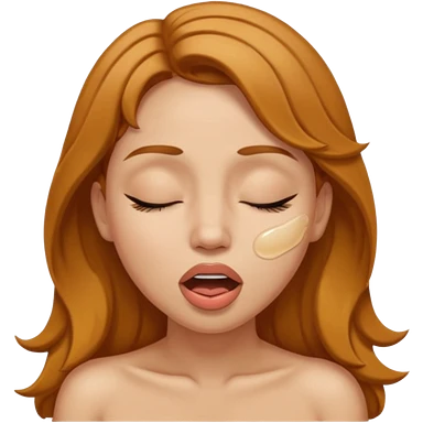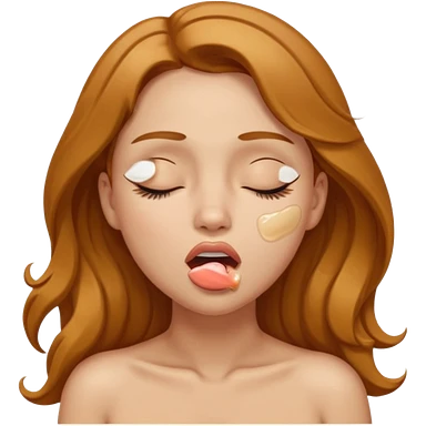 A light-skinned naked adult female with golden-brown hair, with eyes closed and mouth open with white thick fluid on her lips and left cheek. emoji
