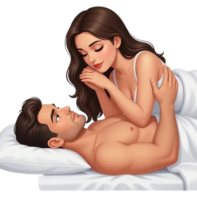 Women on chest of man, man below her. Only feet visible of both showing woman is on top man. . Showing couple intimate moments on bed. emoji