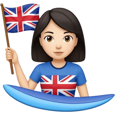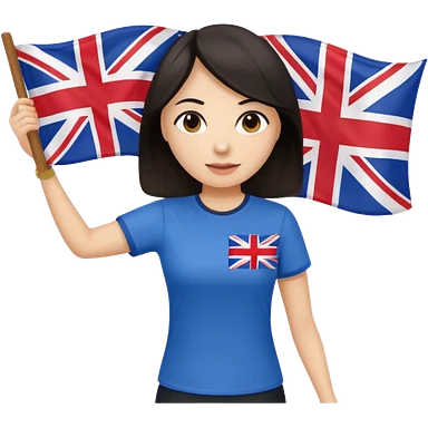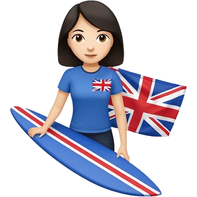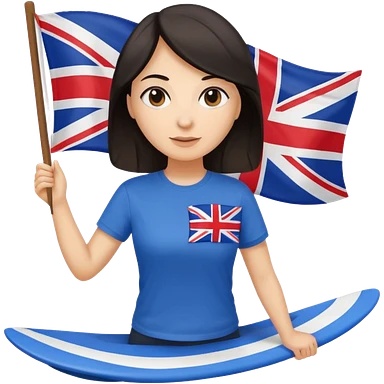 Woman teacher with dark hair in T-shirt with the UK flag surfing emoji