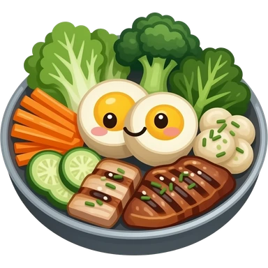 kawaii bibimbap emoji, rice with green vegetables and fried egg, simple cute icon style emoji