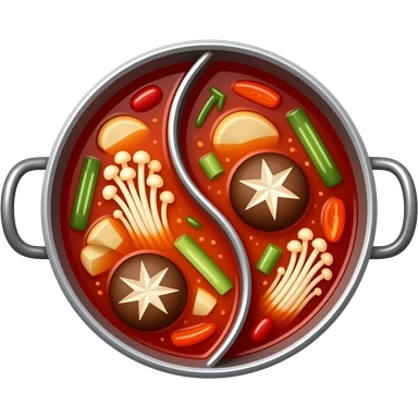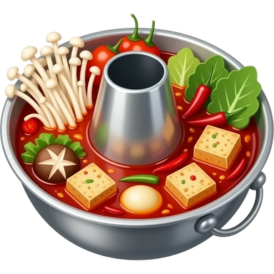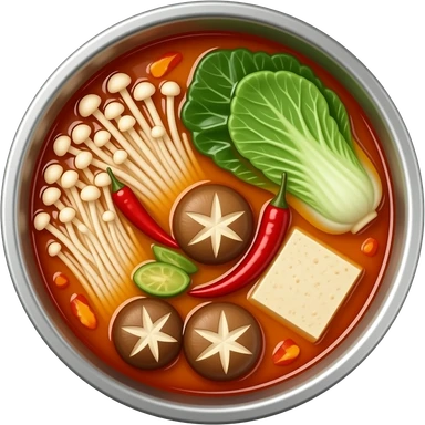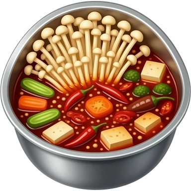 spicy mala hot pot, red chili oil broth, enoki mushrooms, vegetables, tofu, dried chili peppers, chinese style hot pot, stainless steel bowl, top view, realistic food photography emoji