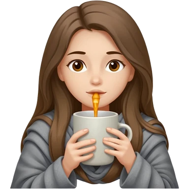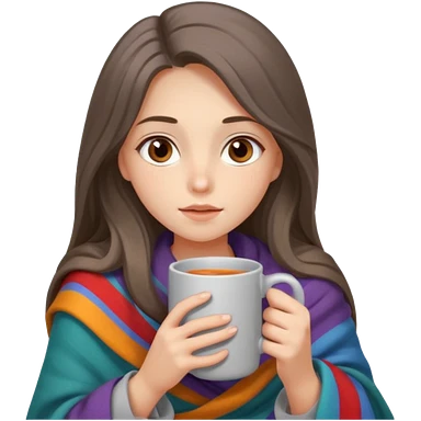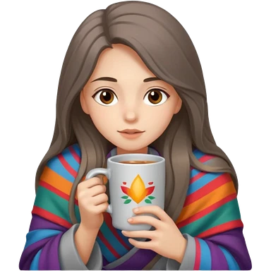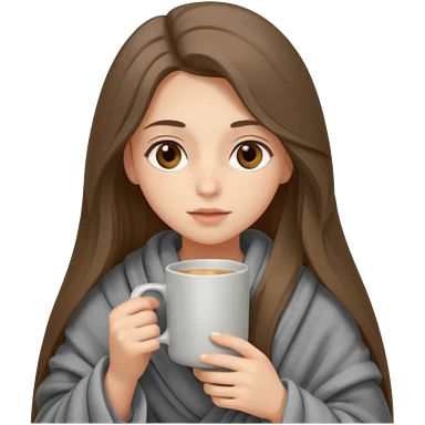 Brown-eyed, fair-skinned girl with long hair down to her shoulders, wrapped in a gray blanket, drinking from a New Year's mug emoji