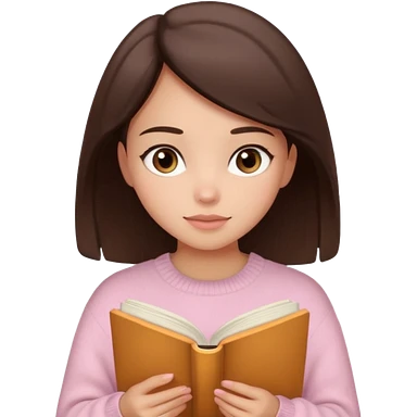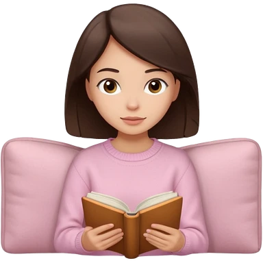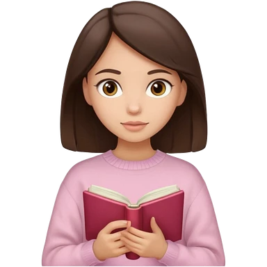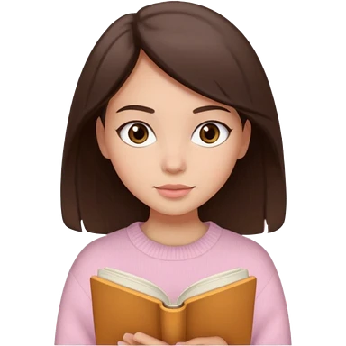 Pretty brown eyed brunette girl with light pink sweater reading cozy emoji