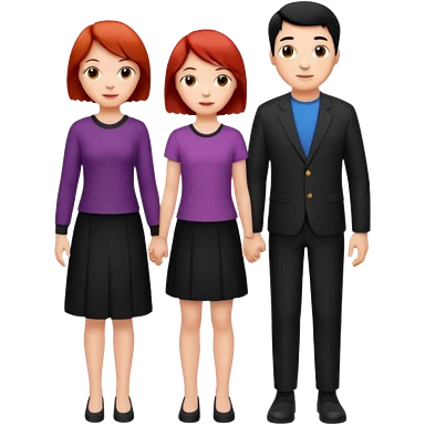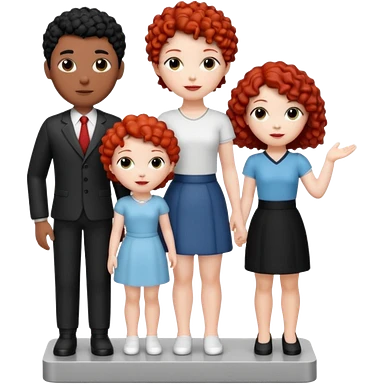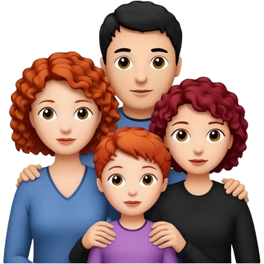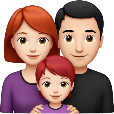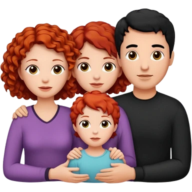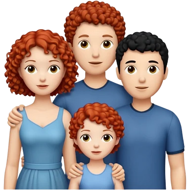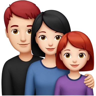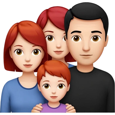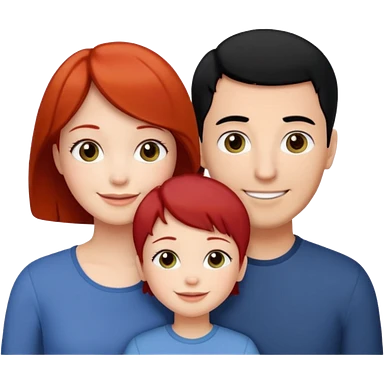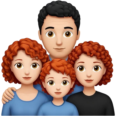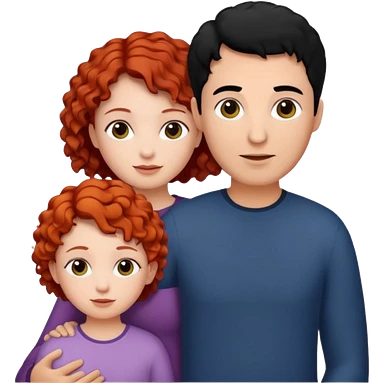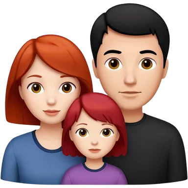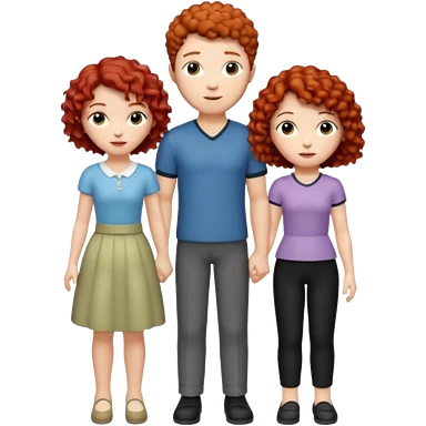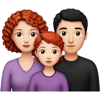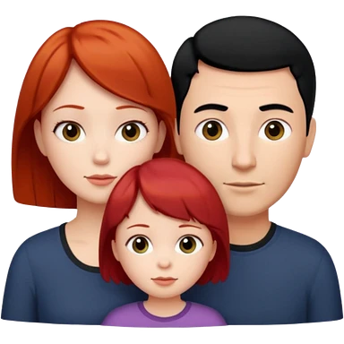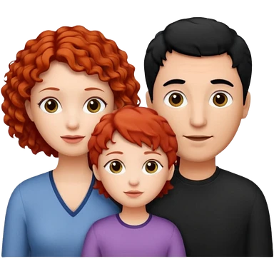 crie uma figurinha com uma família de três uma mulher branca de cabelo cacheado curto vermelho um homem branco de cabelos preto e uma menina branca de cabelos cacheados preto emoji