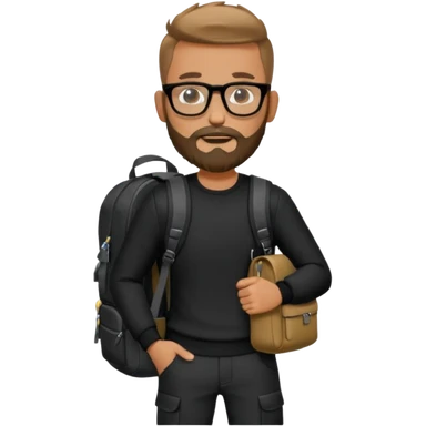 A stylish adventorous man in a complete black outfit with glasses and backpack and beard emoji