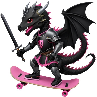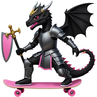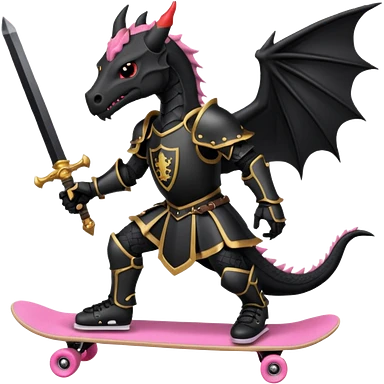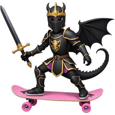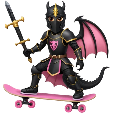 zwarte ridder met een zwarte zwaart en een zwarte schild met een zwarte draak op en hij skate met een roze skatebord en hij zit tegen een draak te vechten emoji