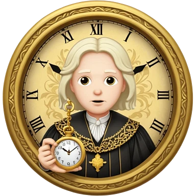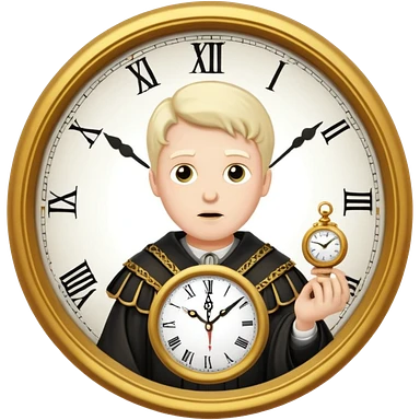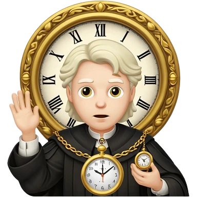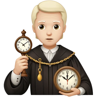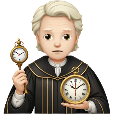 a 1600s judge with a hurried expression holding a clock that ticks VERY FAST emoji