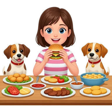 Niña comiendo amburgueza y en la mesa perros y mucha comida emoji