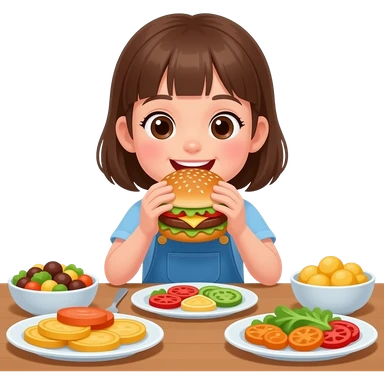 Niña comiendo amburgueza y en la mesa y mucha comida emoji