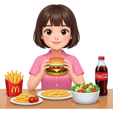 Niña con blusa rosada comiendo amburgueza y en la mesa y mucha comida emoji