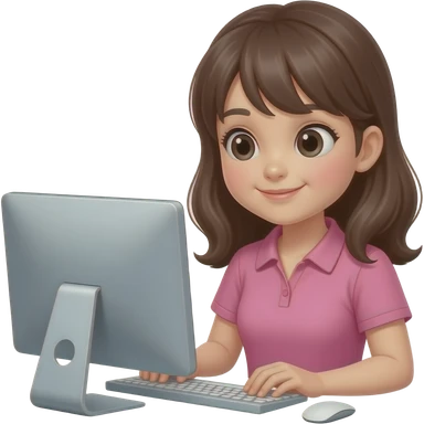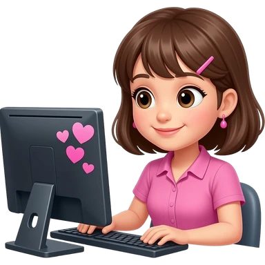 Niña con blusa roada viendo computador con stickers rosado emoji