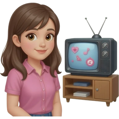 Niña con blusa rosada viendo televisor con stickers rosado emoji