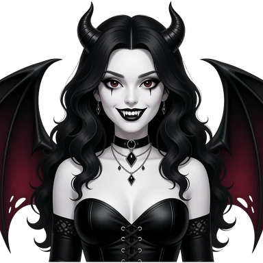 a ghotic succubus, ghotic makeup, arm wavy black hair, white skin, black corset, black eyes iris, big teeths, sedutive, dangerous woman, like a BIG WOMMAN emoji