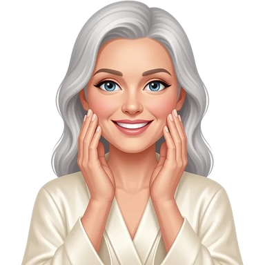 An elegant silver-haired woman, wearing a cream silk robe, smiling warmly and serenely touching her luminous cheeks with both hands, showcasing a sophisticated, deeply hydrated interior glow. Her nails are painted in a clean, nude tone. emoji