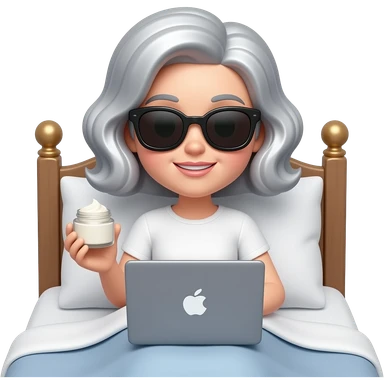 3D Memoji, 60s woman, silver wavy bob, white t-shirt, black sunglasses, lying in bed, holding cream jar, laptop on lap, white background emoji