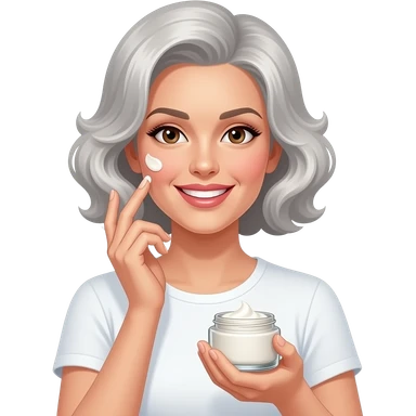 Style: simple render, no outline, soft studio lighting, white background. Character: 60s elegant woman, wavy silver bob, brown eyes, white t-shirt. Skin: natural healthy glow, dewy interior glow. Style + Character + Skin + Action: smile, applying white cream to cheek, holding glass cream jar. emoji