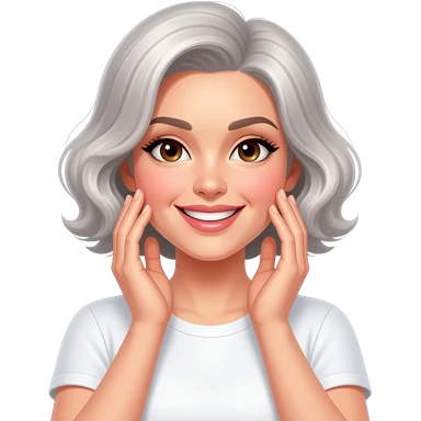 Style: 3D Memoji style, simple render, no outline, soft studio lighting, white background. Character: 60s elegant woman, wavy silver bob, brown eyes, white t-shirt. Skin: natural healthy glow, dewy interior glow. Style + Character + Skin + Action: smile, touching luminous cheeks with both hands. emoji