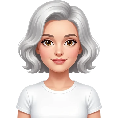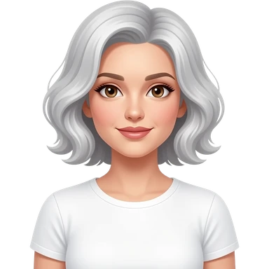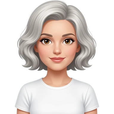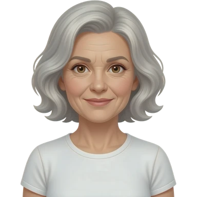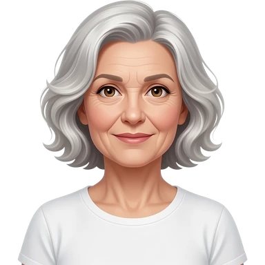 Style: 3D Memoji style, simple render, no outline, soft studio lighting, white background. Character: 60s elegant woman, wavy silver bob, brown eyes, white t-shirt. Skin: natural healthy glow, dewy interior glow. emoji